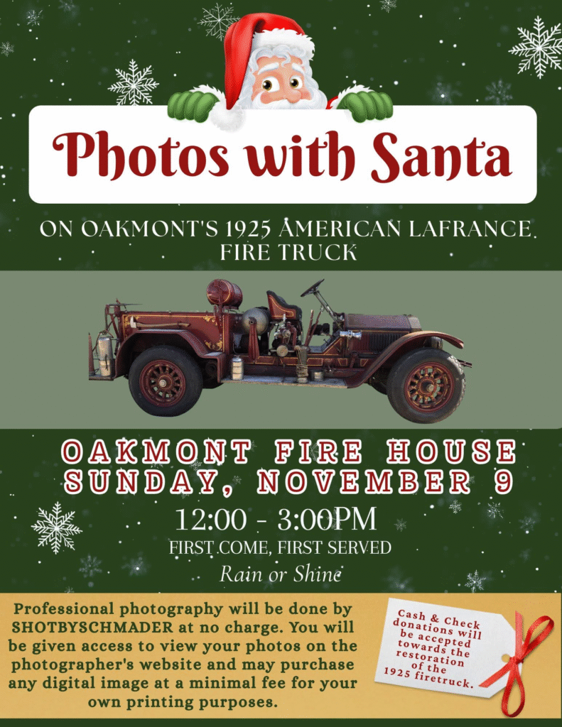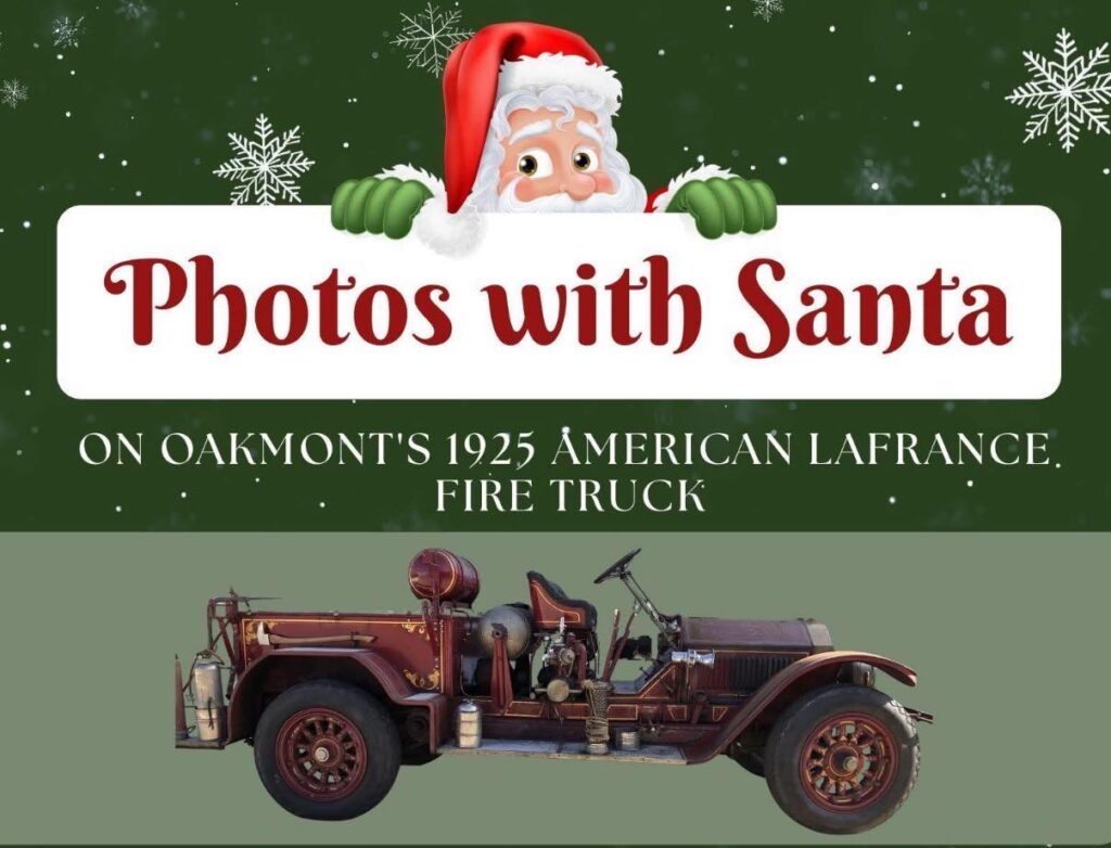 Come join the holiday fun on Sunday, November 9th from 12 PM to 3 PM at the Oakmont Fire House! Snap a festive photo with Santa himself aboard our 1925 American LaFrance Fire Truck — a true piece of history!